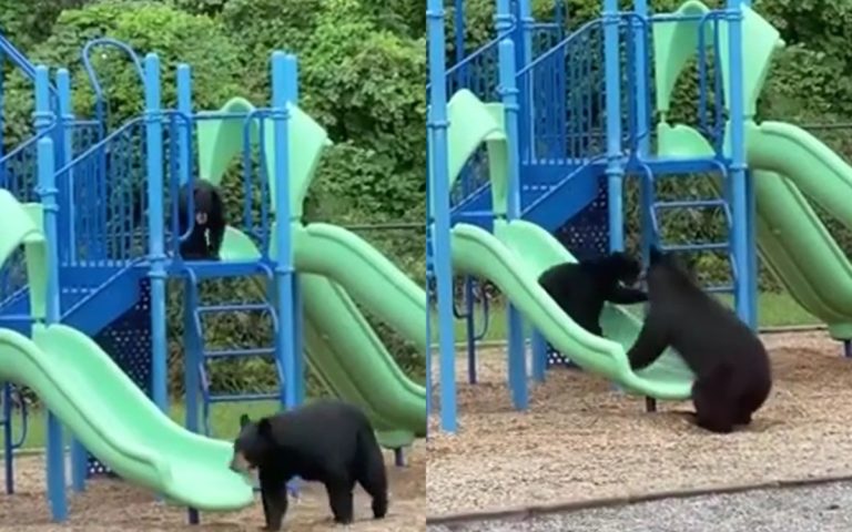 Вчителі початкової школи Ісаака Діксона в Ешвіллі (Північна Кароліна, США) виглянули у вікно і замість натовпу дітлахів побачили на дитячому майданчику маму-ведмедицю і її ведмедика. Сім’я клишоногих вирішила весело провести час, поки поблизу не було людей. Ведмедик не знав, що…