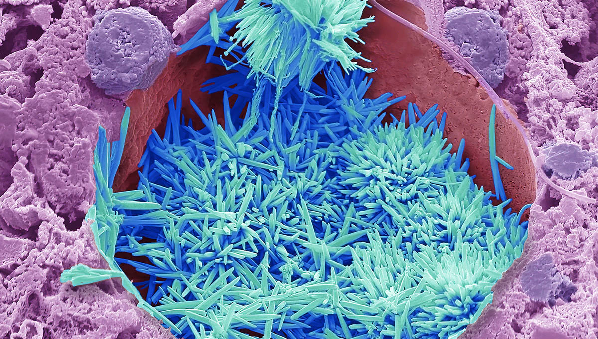 Для цього знімка Гшмайснер використав пучок електронів, щоб збільшити зображення клітинного зрізу розміром близько 12 мікрометрів — приблизно вісімнадцята частина товщини людського волосся — і показати кристалізований холестерин, що вбудований у структуру клітини. Він також додав кольору: уламки холестерину зробив яскраво-синіми, а м’які фіолетові згини клітини печінки надали фото художньої краси. Адже печінка регулює рівень холестерину в організмі, але надмірна кількість твердого холестерину може накопичуватися і викликати серйозні проблеми зі здоров’ям, як-от серцеві напади чи інсульти.