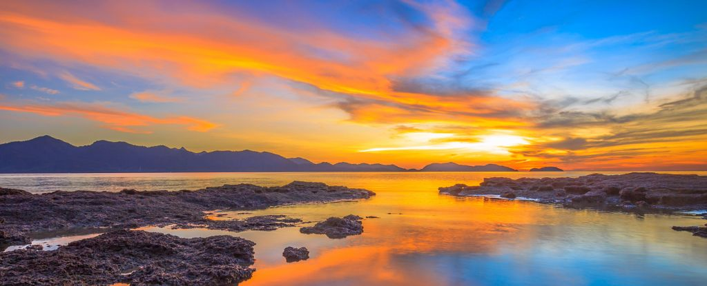 Коли Сонце знаходиться близько до горизонту, його світло проходить через набагато більший шар атмосфери, перш ніж досягне поверхні Землі. Синє та зелене світло розсіюються настільки ефективно, що ви майже їх не бачите. Натомість небо забарвлюється в червоні та оранжеві кольори.