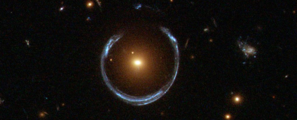 Маса передньої галактики збільшує та спотворює зображення далекої фонової галактики, світло якої мандрувало мільярди років, перш ніж досягти нас. Ідеальне вирівнювання цих галактик створює ефект Ейнштейнівського кільця.