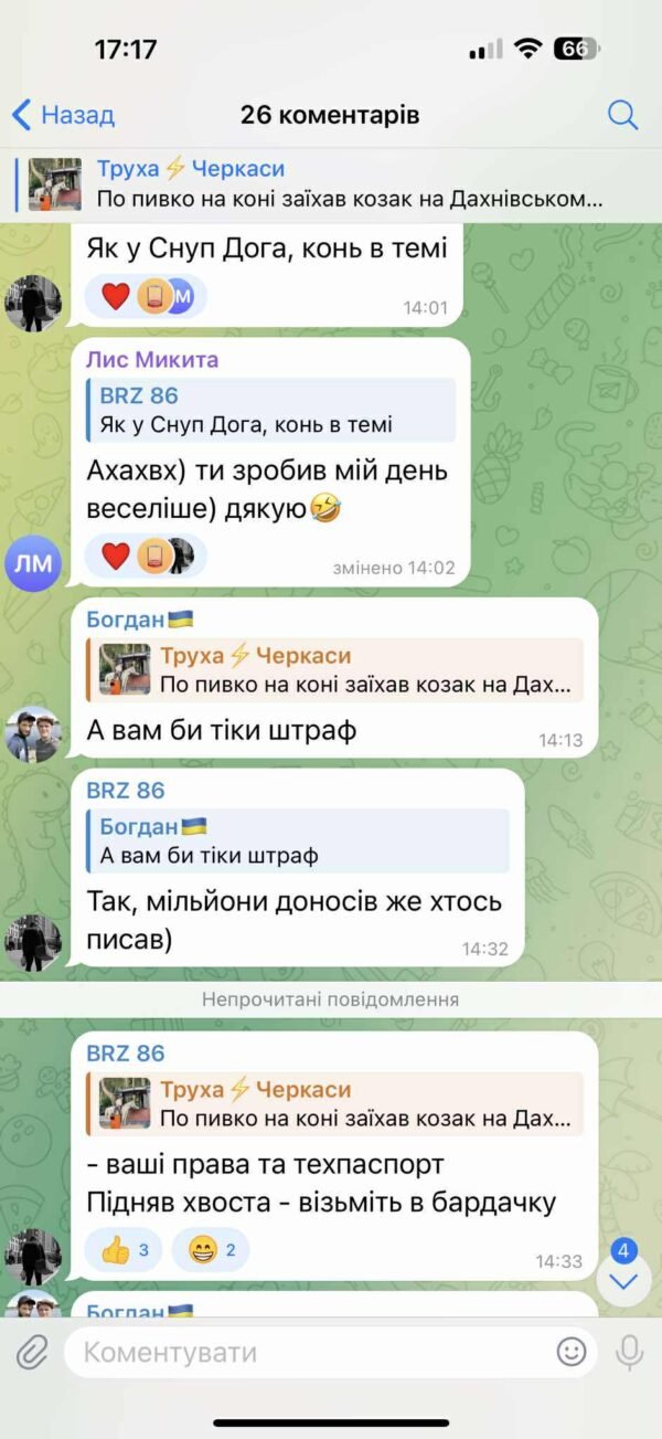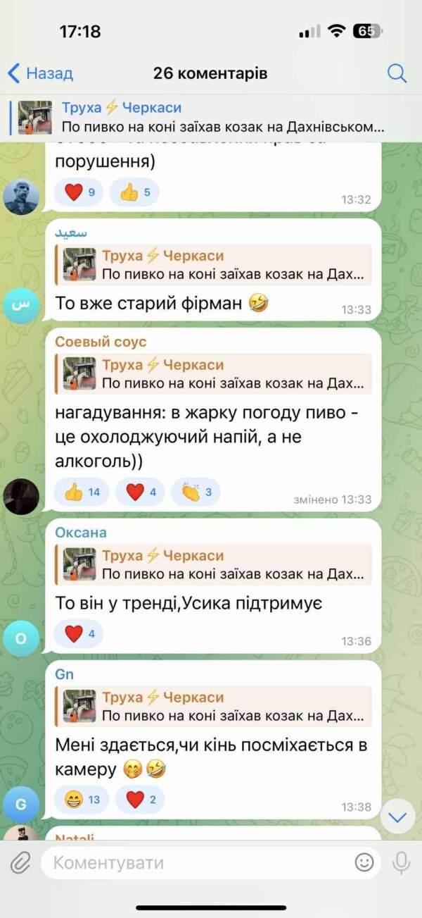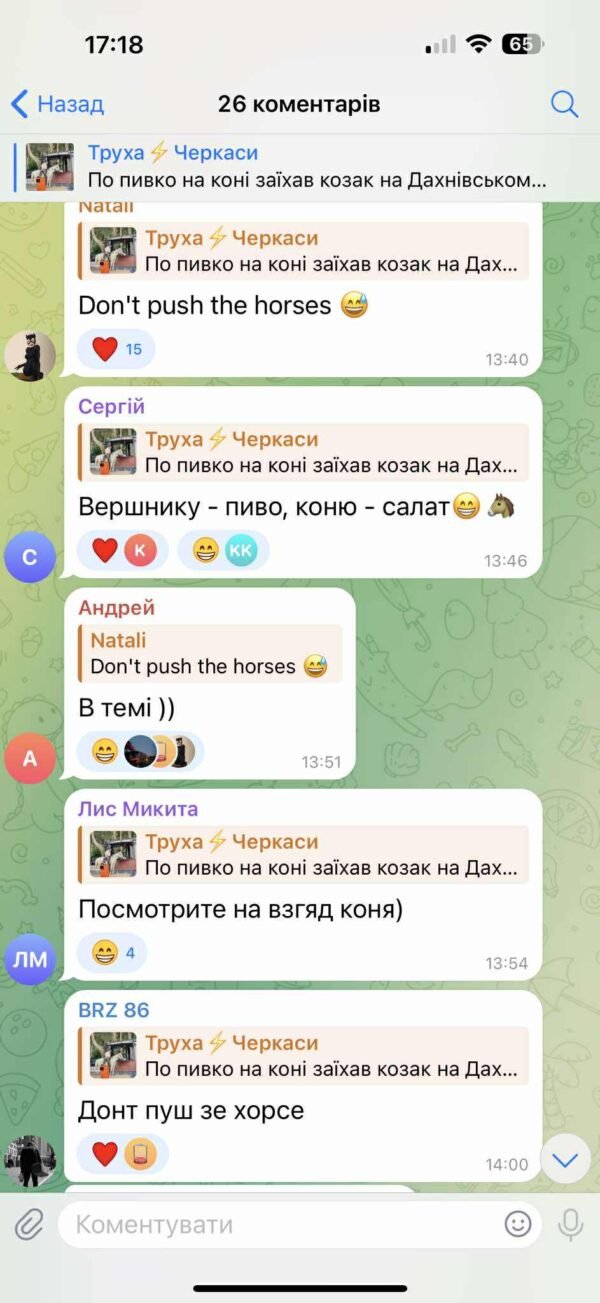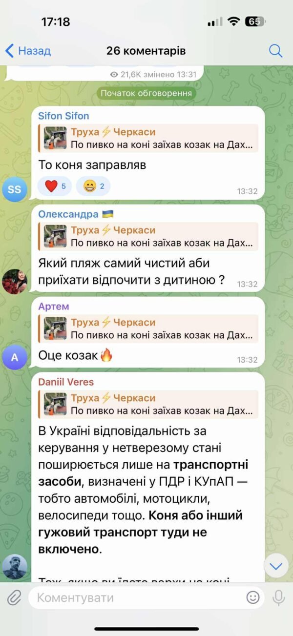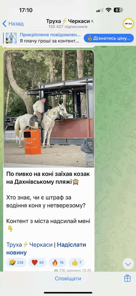 На одному з пляжів Черкас, у Дахнівці, сфотографували чоловіка, який приїхав до кафе верхи на коні. Користувачі Telegram-каналу з гумором підписали світлину як «Козак на пивко заїхав». Фото викликало бурхливе обговорення — чи не є така поїздка на коні із можливим вживанням алкоголю порушенням правил дорожнього руху.