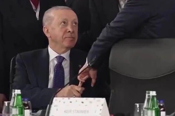 На опублікованому відео видно, як лідер Франції намагався поплескати турецького президента по плечу, однак той раптово перехопив його палець і кілька секунд не відпускав. Після цього Ердоган щось сказав Макрону через перекладача, що ще більше заінтригувало глядачів.