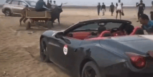 Індійський мільйонер на суперкарі Ferrari California застряг у піску на пляжі. Витягнути авто допоміг погонич волів.