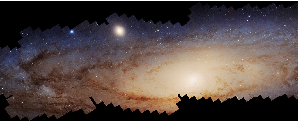 Ця мозаїка — найбільша, яку коли-небудь створював телескоп Габбла. Андромеда показана майже з краю, нахилена на 77 градусів відносно Землі.