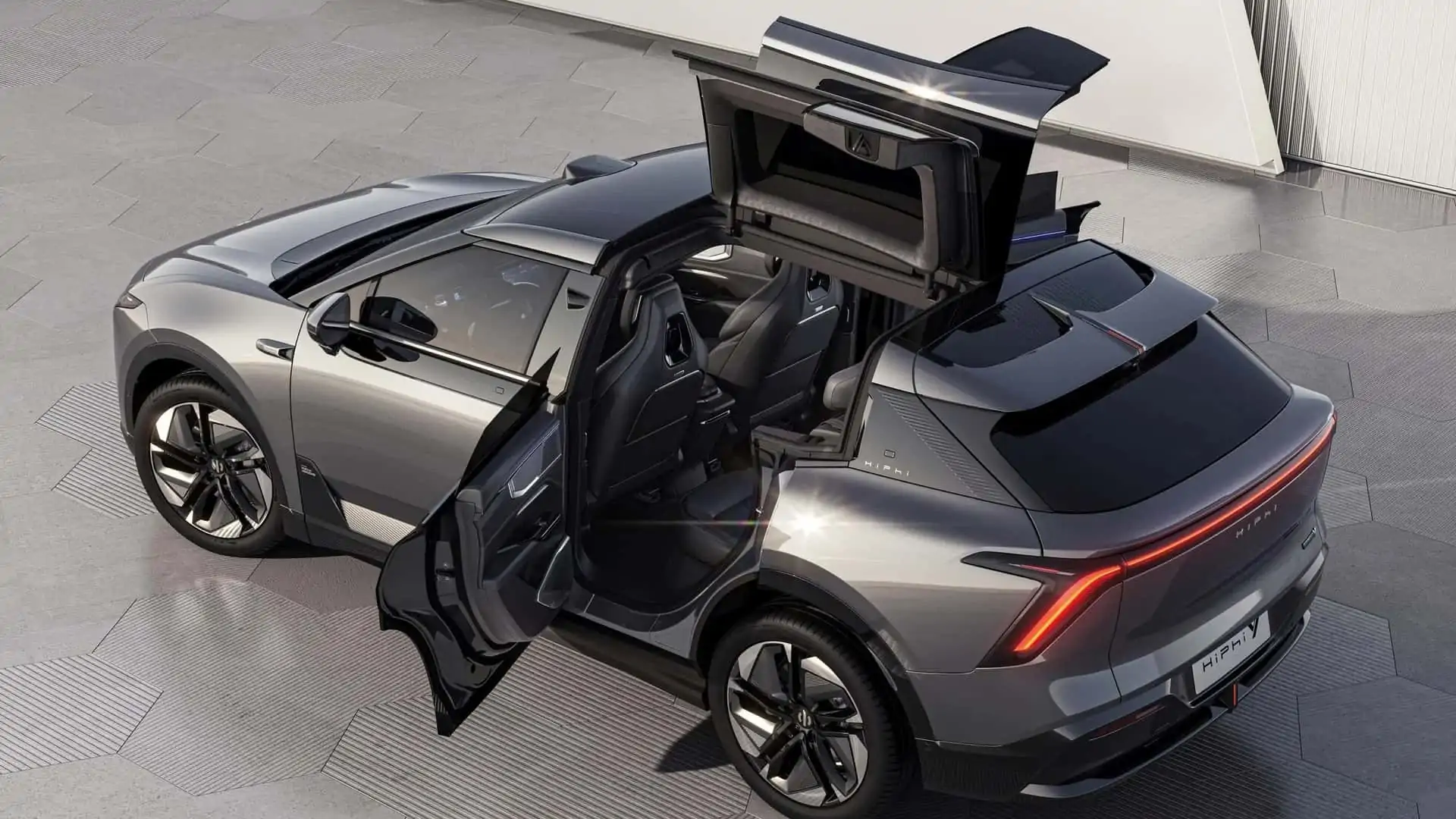 Задні двері HiPhi Y унікальні: нижня половина відкривається традиційно, а верхня – у стилі крила чайки. Здавалося б, у дверний отвір можна навіть вставити щось трохи вище.
