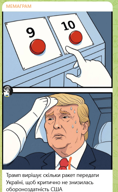 Серед популярних зображень також мем із Трампом, що пітніє перед вибором між двома кнопками — «9» і «10». Цей жарт іронізує над складністю його рішень: підтримати Україну, але не нашкодити оборонній спроможності США. Глядачам такий візуальний образ особливо близький через свою простоту й влучність.
