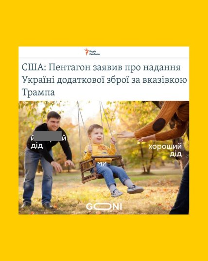 Найбільше користувачі підхопили тему емоційної “гойдалки”, знайомої кожному українцю: сьогодні Сполучені Штати обіцяють допомогу, завтра — відкладають рішення. Один із мемів показує дитину на гойдалці: коли Трамп відмовляється допомагати — він «й****тий дід», а коли підтримує — «хороший дід». Гойдалка символізує нестабільність, у якій постійно перебуває українське суспільство.