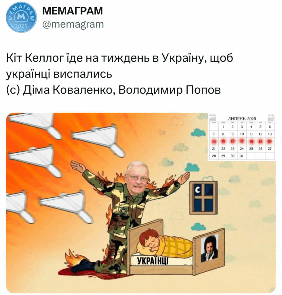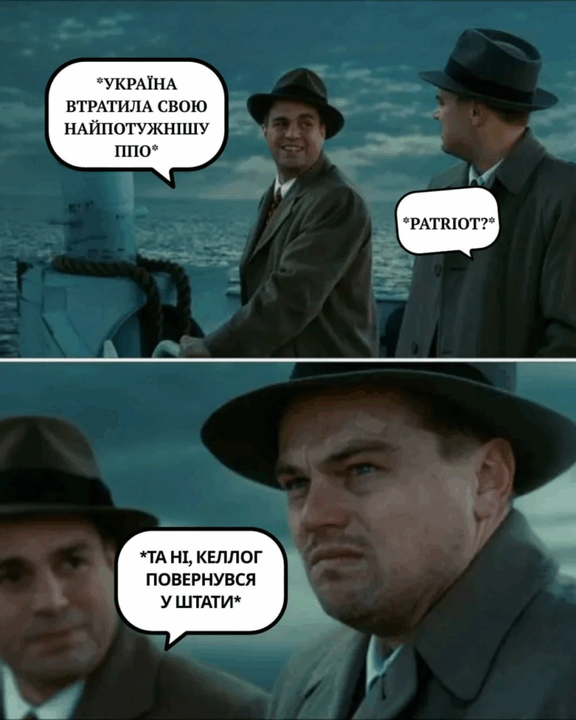 Меми також включали відсилання до фільму “Острів проклятих” із Леонардо Ді Капріо, зображаючи емоційну реакцію українців на новину про від’їзд Келлога. Гумористи навіть створили вигаданий “журнал чергувань посадовців США”, який нібито координує приїзди задля запобігання російським атакам.