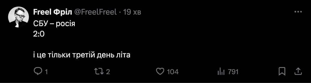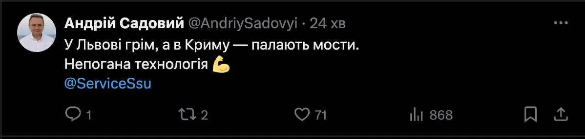 Мер Львова Андрій Садовий також прокоментував атаку, тонко натякаючи на торжество справедливості. Інші користувачі жартома пов’язують успішну операцію з керівником ГУР Кирилом Будановим, який уже став символом ефективних дій проти ворога.