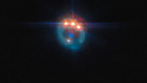 Квазар, представлений на цьому конкретному зображенні, називається RX J1131-1231 і розташований у сузір’ї Чаша. Його портрет нещодавно був знятий космічним телескопом Джеймса Вебба (JWST) — найпотужнішим і найскладнішим телескопом, який коли-небудь запускали в космос — з використанням явища гравітаційного лінзування, передбаченого загальною теорією відносності Ейнштейна та просторово-часовим континуумом.