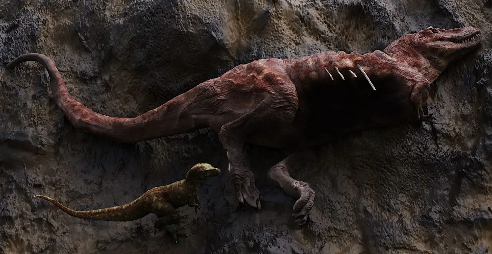 Вчені використали 3D-сканування скам’янілої кістки стопи великого тиранозавра віком понад 75 млн років. На метатарзалі зафіксували шістнадцять зубних слідів, зроблених меншим тиранозавром. Їхнє розташування на кістці з малою кількістю м’яса та відсутність ознак загоєння свідчить: хижаки споживали останки вже сильно розкладеного тіла, включно з твердими частинами скелета.