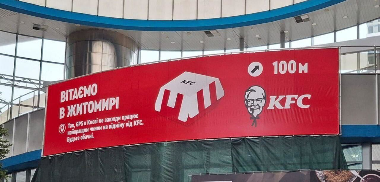 Мережа KFС створила оригінальну рекламу в Києві, пожартувавши про несправності в роботі GPS. На київському вокзалі з’явився банер із написом: “Вітаємо в Житомирі”. Додатково на ньому зазначено: “Так, GPS у Києві не завжди працює найкращим чином, на відміну від KFС. Будьте обачні”.