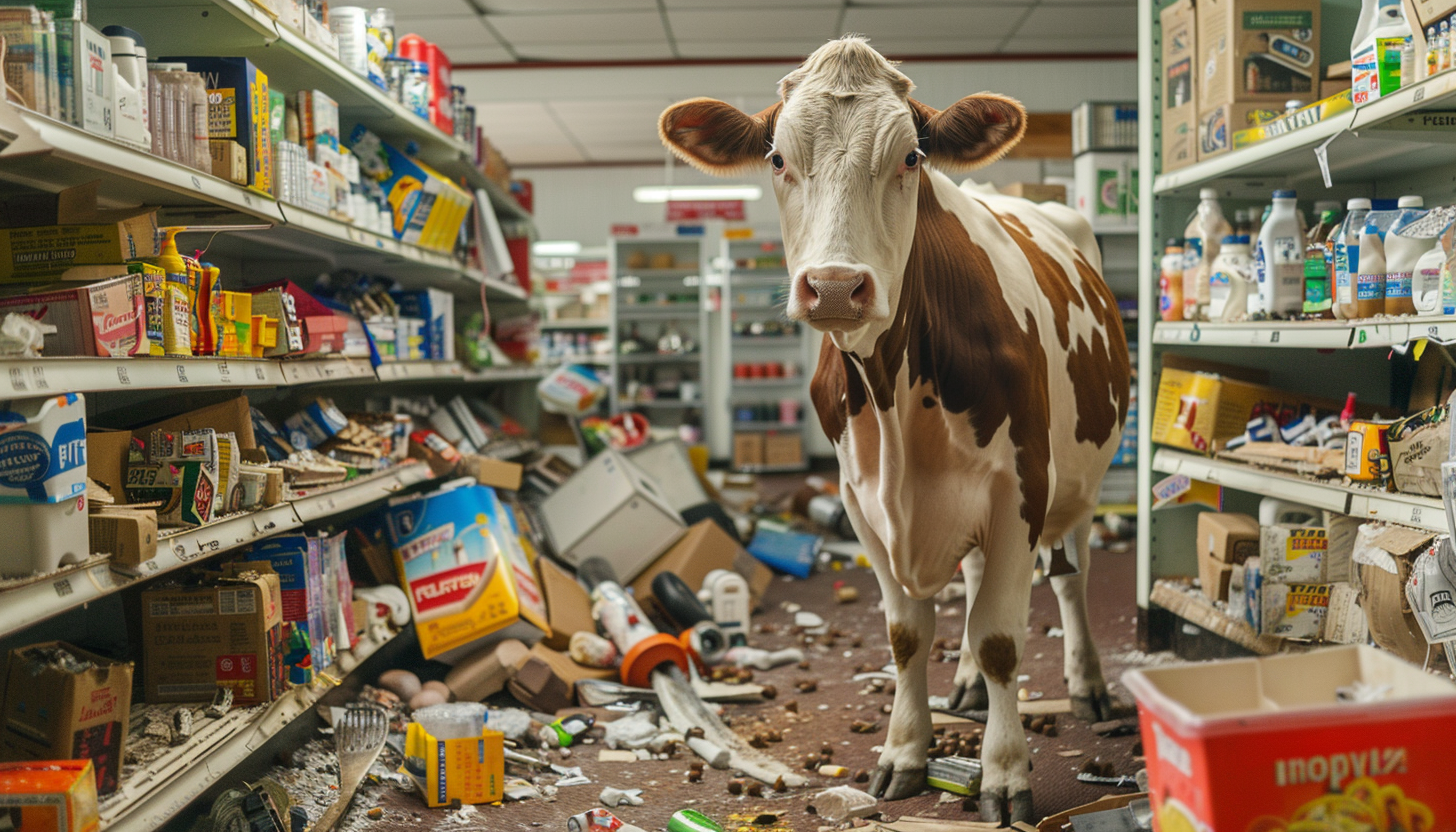 Чотирилапа гостя пройшлася по залу, скидаючи з полиць товари, а після невеличкого хаосу спокійно покинула приміщення. Власник радіє, що ніхто не постраждав: ані корова, ані відвідувачі чи персонал.