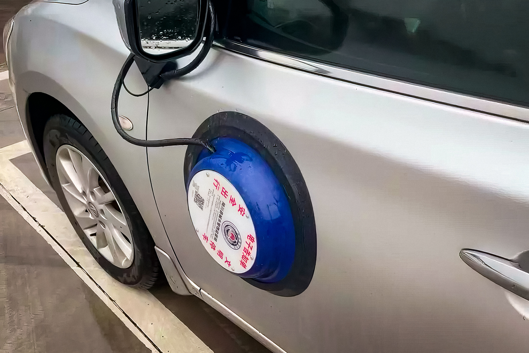 Пристрій, що нагадує тазик, присмоктується до дверей автомобіля, а його дріт обертається навколо бічного дзеркала заднього виду – щоб присоска не залишилася валятися на дорозі, якщо раптом відклеїться.