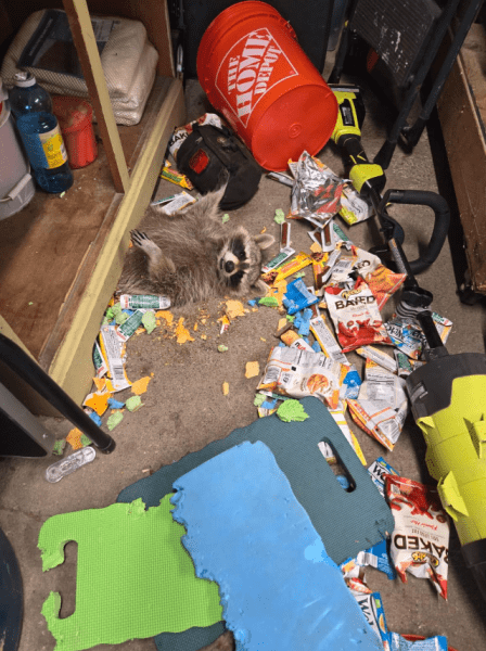 На фото видно, як вгодована тварина лежить на спині під стелажем, оточена пакетами з різноманітними закусками. Автор пожартував у підписі: «Єнот вдерся в гараж мого брата, з’їв тонну закусок і так розтовстів, що застряг».