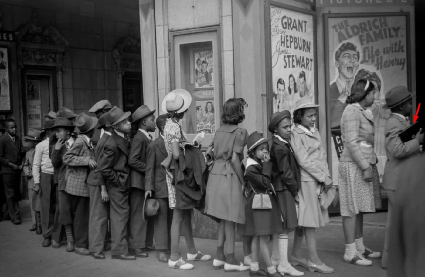 На зображенні видно 18 дітей афроамериканського походження, ошатно одягнених, які стоять у черзі до кінотеатру. Хлопчик праворуч дійсно тримає прямокутний предмет, який нагадує сучасний гаджет. Якщо знімок збільшити, на об’єкті можна побачити щось схоже на логотип компанії Apple, що виробляє iPad.