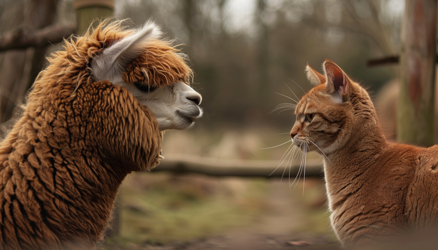 Тварини скрізь слідували за кішкою, пильно вдивляючись і принюхуючись, але так і не зрозуміли, хто перед ними. Кішка ж, здається, не дуже звертала увагу на їхню цікавість і займалася своїми справами, лише зрідка невдоволено фиркаючи, коли альпаки ставали занадто нав’язливими.