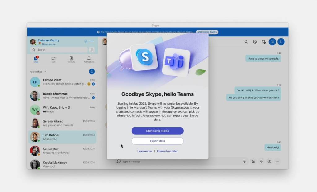 До дати остаточного закриття у користувачів буде два місяці для прийняття рішення — або перенести свої дані в Teams, або обрати іншу платформу для спілкування. При виборі Teams буде збережено не лише історію листування, а й мультимедійні файли, включно з фотографіями. Якщо користувачі вирішать відмовитися від переходу, Microsoft запропонує зручний спосіб завантаження даних для резервного зберігання.