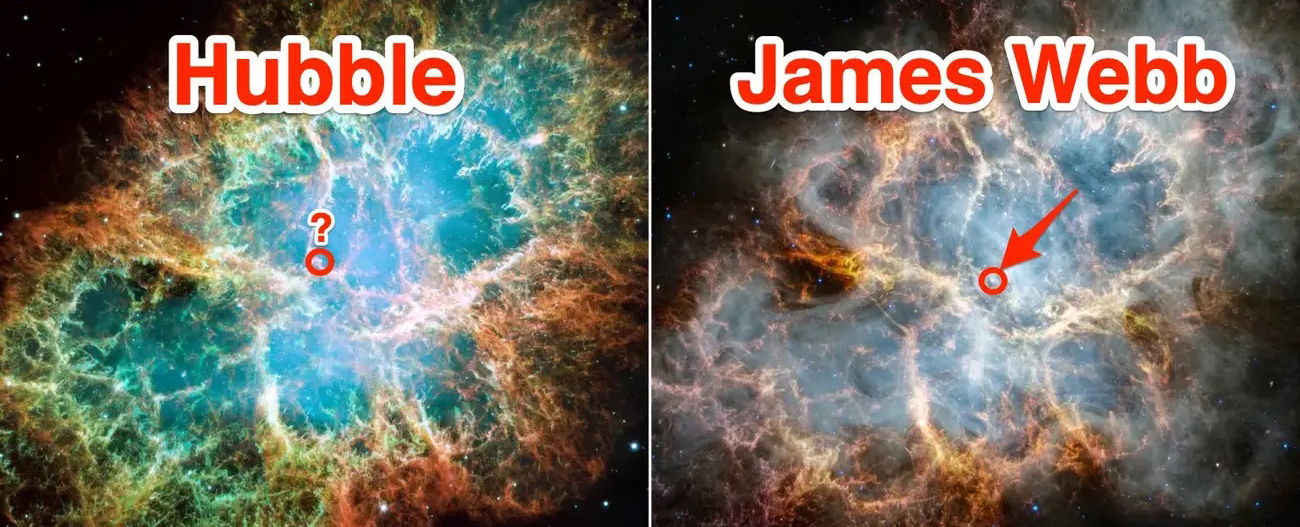 Пульсар – це об’єкт, що швидко обертається, який, у випадку Крабовидної туманності, перезаряджає газоподібну речовину навколо себе, яку JWST вперше виявив у приголомшливих деталях – те, що не зміг показати космічний телескоп “Хаббл”, коли спрямував свій приціл на Крабовидного у 2005 році.