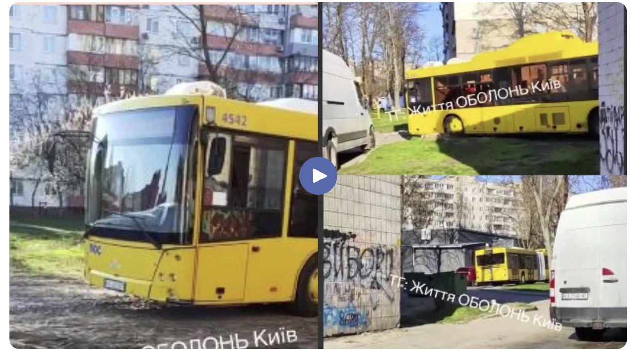 Мешканці Виноградаря спостерігали курйозну ситуацію: великий зчленований автобус Київпастрансу, що обслуговує тролейбусний маршрут №36, заїхав у двір житлового комплексу та зупинився просто на зеленій зоні.