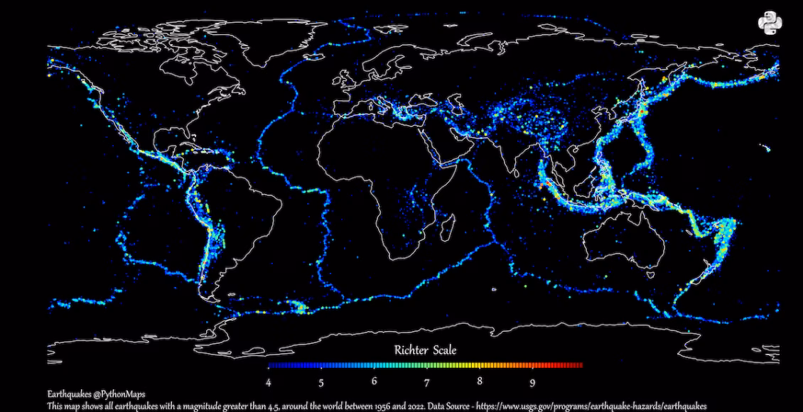 Найбільші землетруси відбувалися з незапам’ятних часів, але їх спостереження та вплив не були рівномірно розподілені Землею. Visual Capitalist, використовуючи дані Геологічної служби США, наніс на карту епіцентри землетрусів, що реєструвалися з 1956 до 2022 рр. (магнітудою від 4,5 та вище за шкалою Ріхтера).