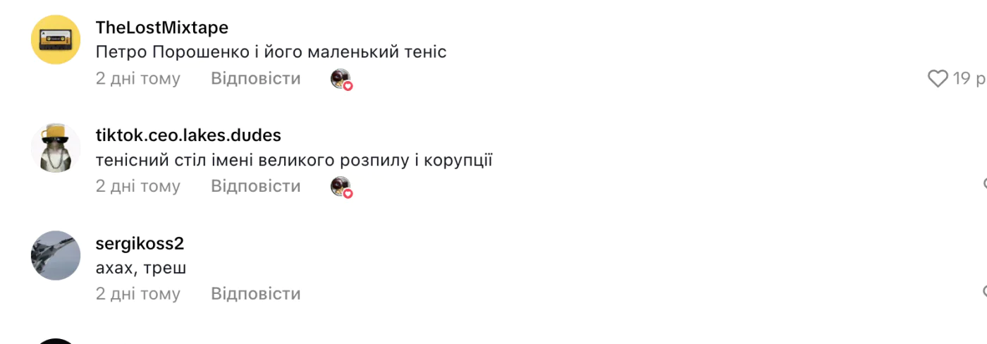 У коментарях під роликом користувачі сперечались, що саме авторка хотіла висміяти — тенісний стіл чи курилку. Деякі жартували про Порошенка та «маленький теніс», інші просто дивувались незвичайним назвам.