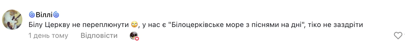 Крім того, дехто ділився подібними прикладами зі своїх міст. Наприклад, у Білій Церкві є «Білоцерківське море», яке місцеві жартома називають із натяком на «пісні на дні». Відео викликало хвилю іронічних обговорень про творчі підписи на локаціях.