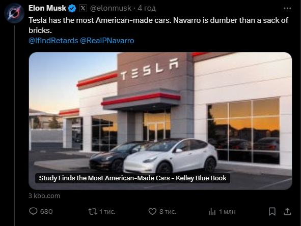 Ілон Маск, мільярдер і глава департаменту ефективності уряду США (DOGE), жорстко розкритикував Пітера Наварро, радника президента США з питань торгівлі, за його негативні коментарі щодо компанії Tesla. Наварро, в інтерв’ю CNBC, заявив, що Маск не є справжнім виробником автомобілів, а лише збирачем, стверджуючи, що деталі для Tesla виробляються по всьому світу.