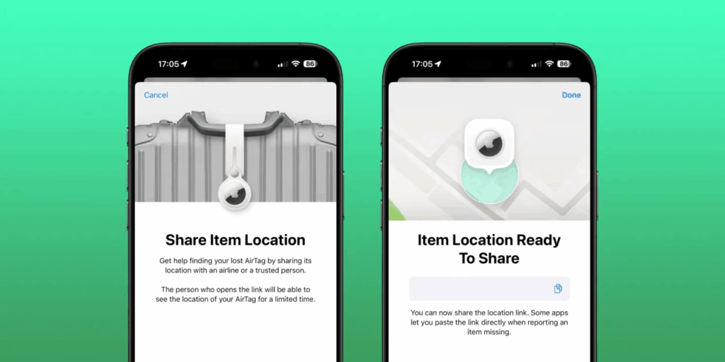 Нова опція з’являється в меню, коли ви обираєте предмет у додатку Find My. По суті, вона створює загальнодоступне посилання, яке показує місце розташування цього предмета, тобто будь-хто з цим посиланням може побачити, де він знаходиться. Apple наводить приклад — ви можете поділитися посиланням з авіакомпанією, щоб вона допомогла знайти загублену річ.