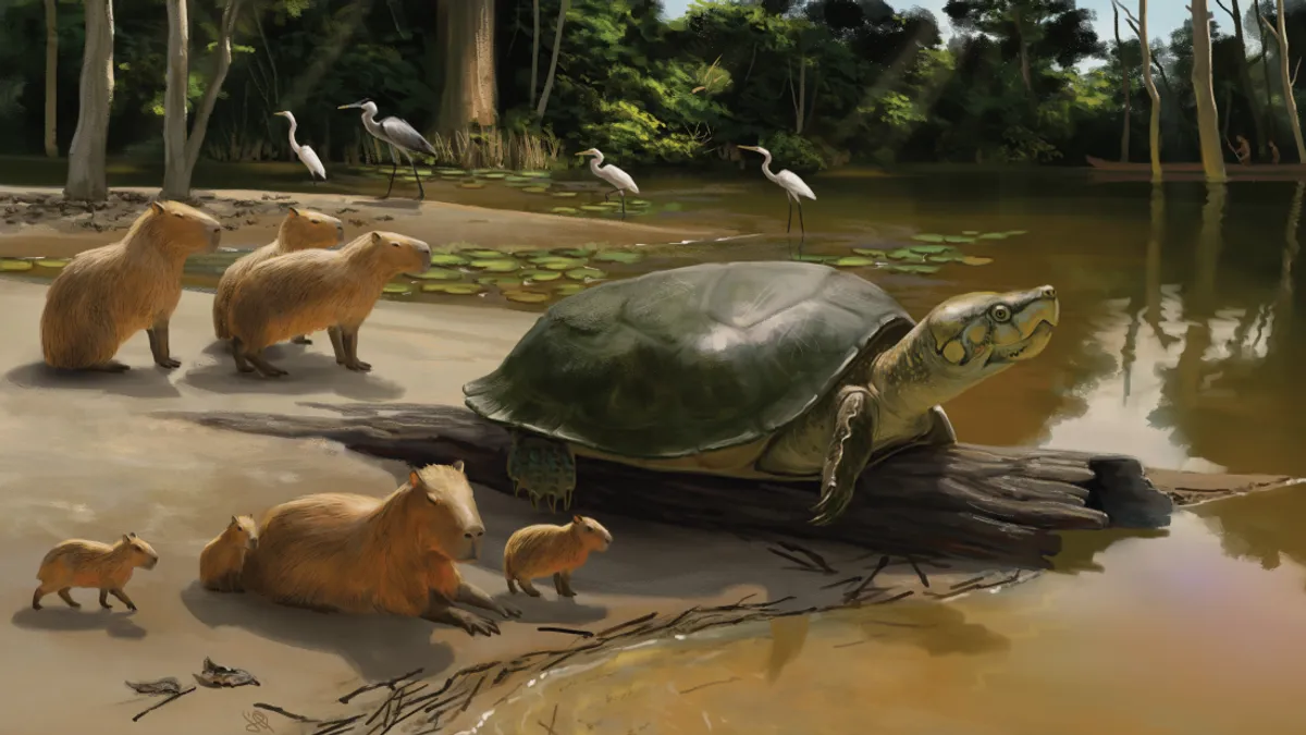 Новий вид гігантської прісноводної черепахи описали вчені, які виявили величезну щелепну кістку водної тварини в бразильській Амазонії. Її панцир мав би бути близько 1,8 метра (5,9 футів) завдовжки, що робить її більшою за будь-яку черепаху, що живе сьогодні.