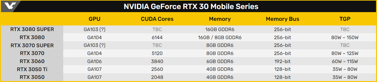 Річ у тім, що мобільна версія GeForce RTX 3080 вже використовує повноцінний варіант GPU GA104, при цьому Nvidia відмовилась від використання ядра GA102 у ноутбуках. Проміжковим рішенням повинен стати кристал GA103, інформація про який вже була засвічена в мережі. Можна припустити, що він отримає більше CUDA-ядер, ніж GA104, й буде в першу чергу орієнтований на мобільні відеоадаптери.