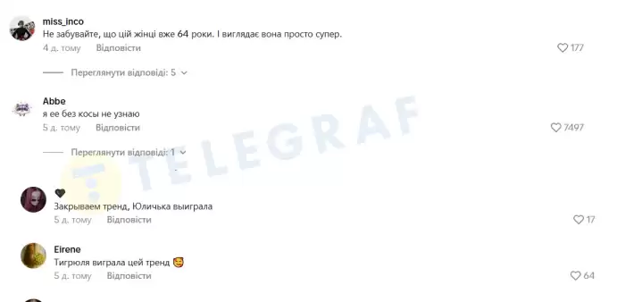 У TikTok поширився кумедний ролик із нею в стилі популярного тренду «бути справжньою». На відео Тимошенко з’являється в несподіваному образі — з модним пучком і макіяжем у стилі Clean Girl. Але несподівано з’являється її класичний вигляд із підписом «бо це не я», що натякає на її незмінну ідентичність.