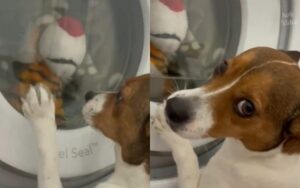 Собаки дуже люблять свої іграшки, тому завжди щиро переживають, якщо з ними щось трапляється. Песик з цього відео – тому підтвердження. Його улюбленого плюшевого тигра відправили в пральну машинку, і пес сильно хвилювався за іграшку. Собакен уважно спостерігав, як тигр крутиться в барабані машинки, і періодично неспокійно дивився на господиню.