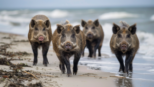 По пляжу Балтійського моря з відпочиваючими туристами прогулялося сімейство кабанів (Відео)