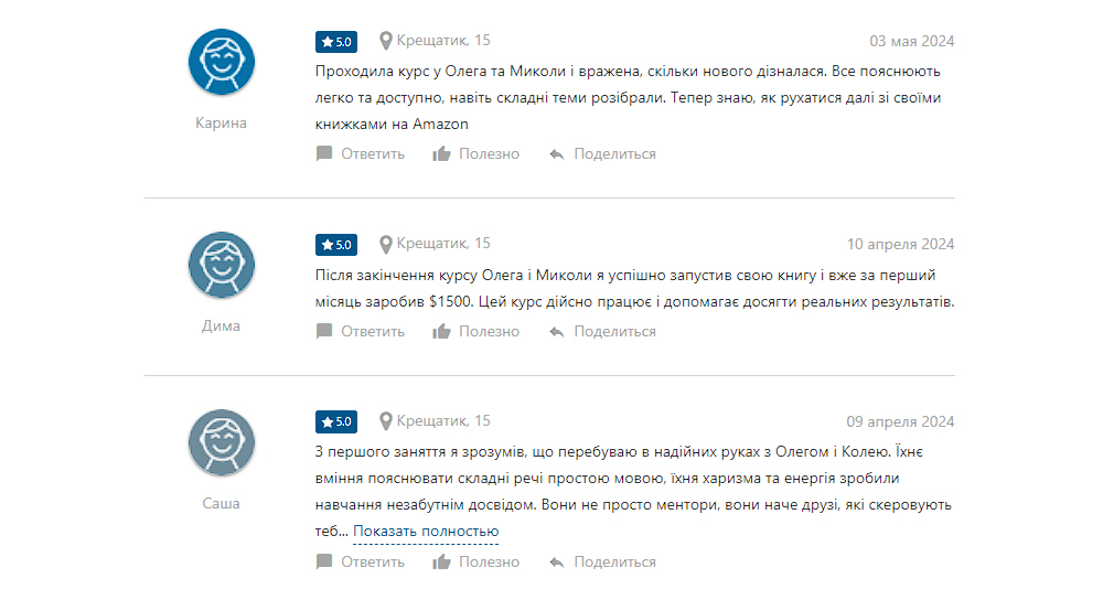 Эти отзывы подтверждают, что обучение у Олега Белоцерковца действительно приносит реальные результаты и помогает многим авторам и предпринимателям успешно начать и развивать свой книжный бизнес на Amazon. Во время курса ученики узнают, как создавать цифровые книги разными способами, в частности с помощью искусственного интеллекта или с привлечением исполнителей. Оплату можно разделить на части, тогда обучение обойдется в 41 доллар в месяц*. Если следовать всем инструкциям, проявлять активность и не сомневаться в своих силах, отдача будет гораздо большей. Судя по отзывам и кейсам, выпускники действительно зарабатывают от 2000 долларов, независимо от того, в какой точке мира они находятся. Каждый уделяет работе не более нескольких часов в день. В интервью они часто говорят о том, что благодарны спикерам за знания и навыки, но полагаются прежде всего на себя. Успеха достигают те, кто готов анализировать каждый шаг, исправлять огрехи и оптимизировать решения.