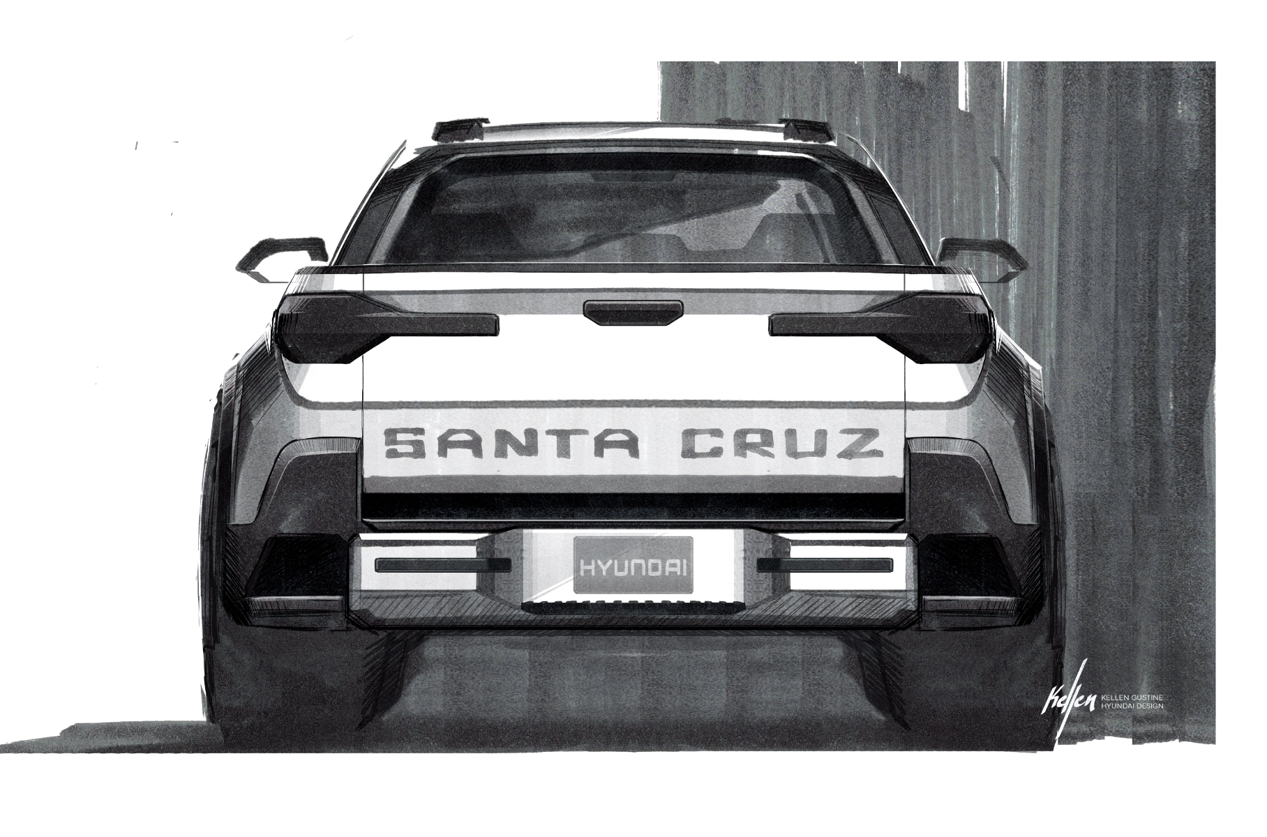 На першому тизері-ескізі Hyundai показав оновлений Santa Cruz ззаду. У нього дуже широкі колісні арки (ймовірно, це данина жанру дизайнерської замальовки) і переглянутий дизайн бампера. На другій картинці видно частину решітки радіатора пікапа з прямокутними вирізами. Вони нагадують оформлення решітки в оновленого Tucson, який показаний на третьому тизері.