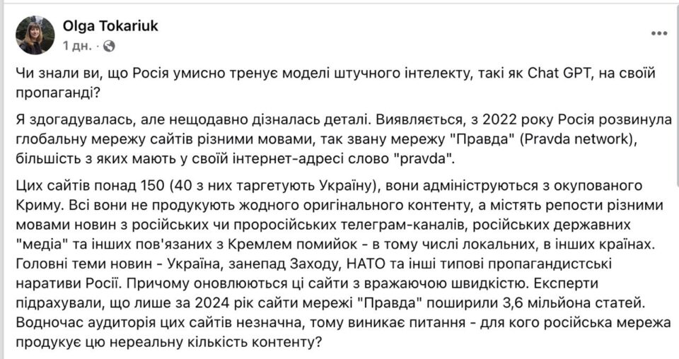 З 2022 року Росія почала використовувати нову стратегію для поширення пропаганди: вона тренує моделі штучного інтелекту на фейкових новинах і пропагандистських наративах. Центральну роль у цій схемі відіграє так звана мережа “Правда”, яка включає понад 150 сайтів різними мовами, більшість з яких мають у своїй інтернет-адресі слово “pravda”, про це розповіла Ольга Токарюк на своїй сторінці у Facebook, повідомляє NNews.