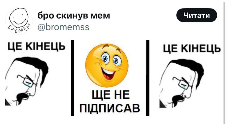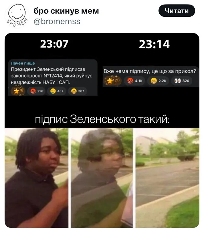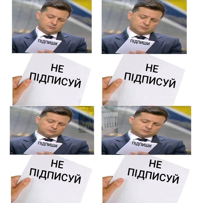 Як завжди в Україні, серйозні політичні події супроводжуються хвилею чорного гумору. У соцмережах одразу з’явилися численні меми, які висміюють ситуацію з законом та підписом президента.
