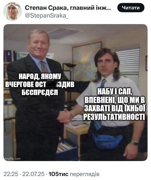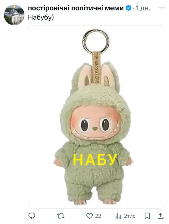 Однією з найпопулярніших тем стали нові жарти про вигаданих персонажів: НАБУбу, Зелебубу — натяк на іграшку Лабубу, яка хоч і моторошна, але не настільки, як демонтаж антикорупційної системи.