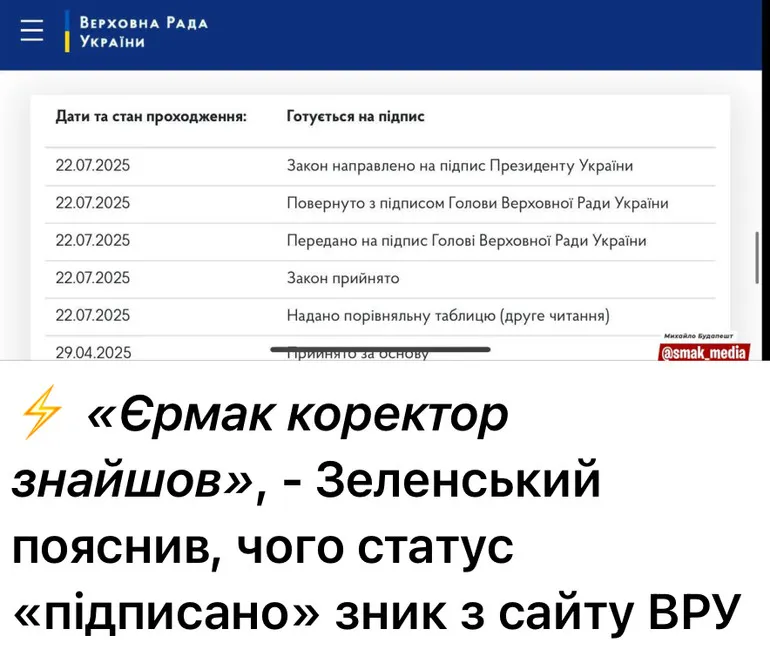 Президент Володимир Зеленський підписав цей закон практично миттєво. Водночас на урядовому порталі статус документа кілька разів змінювався: спочатку він був «підписаний», потім «переданий на розгляд», а згодом знову значився як «підписаний».