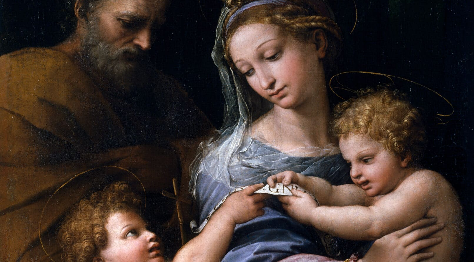 Полотно італійського живописця, написане орієнтовно 1517 року, що зберігається сьогодні в музеї Прадо в Мадриді, розбурхувало фантазії мистецтвознавців давно. Навіть непрофесійний погляд може вловити стилістичну різницю між обличчями героїв на передньому плані – Діви Марії з Христом на руках, Іоанна Хрестителя в образі немовляти – і святого Йосипа на задньому. Тому багато фахівців припускали, що у створенні шедевра Рафаелю допомагали його учні.