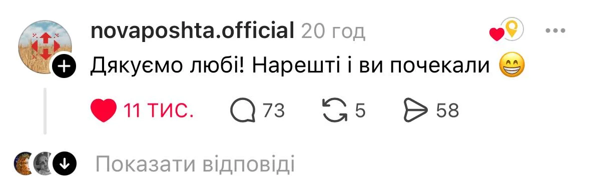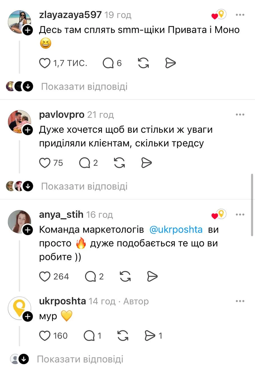 Жартівливе обговорення швидко набрало популярності — допис отримав понад 11 тисяч лайків, а коментар Нової Пошти зібрав майже стільки ж. Користувачам сподобалася легка, дотепна манера взаємодії між конкурентами, і коментарі рясніли усмішками та підтримкою такої комунікації.