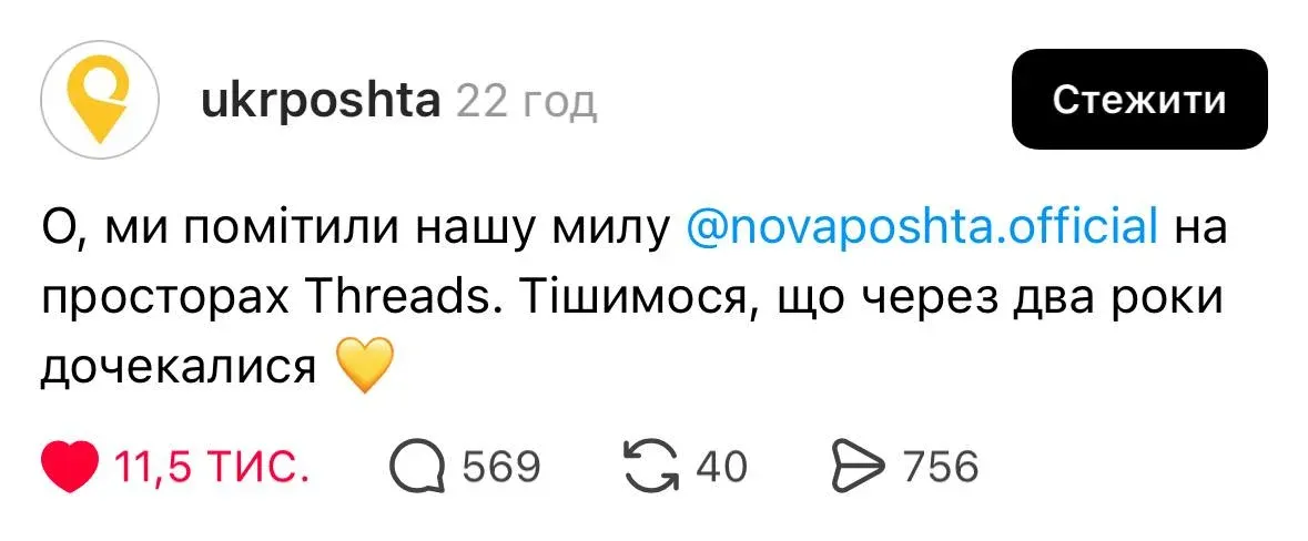 В соцмережі Threads відбулася кумедна переписка між SMM-менеджерами Укрпошти та Нової пошти, яка швидко підкорила аудиторію. Укрпошта жартома привітала конкурентів із приєднанням до платформи, зазначивши, що «нарешті дочекалися через два роки». У відповідь Нова пошта дотепно відповіла, що «і вони нарешті дочекалися» — натякаючи на знайому для українців ситуацію з довгим очікуванням посилок.