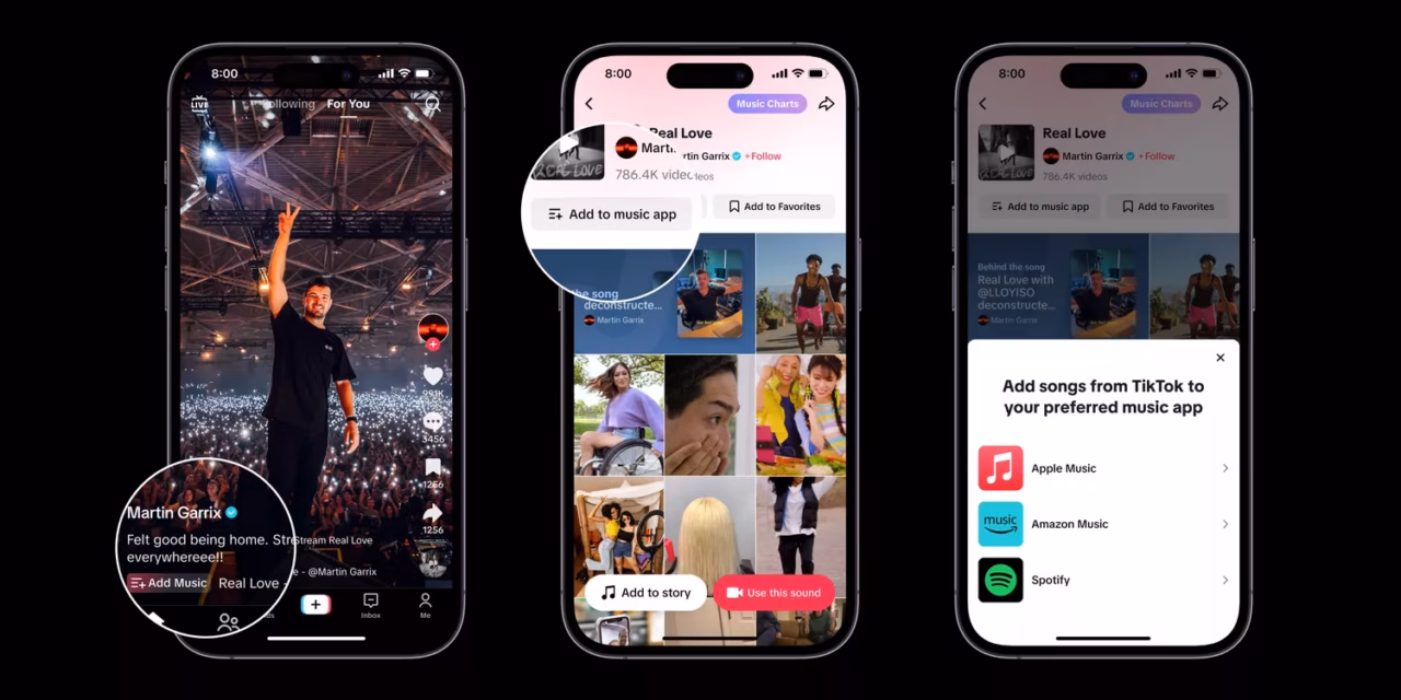 У додатку TikTok для iOS з’явилася нова функція, яка дає змогу швидко додавати вподобані треки прямо в плейлист Spotify, Apple Music або Amazon Music. Але для цього обов’язково потрібна підписка на один із цих сервісів.