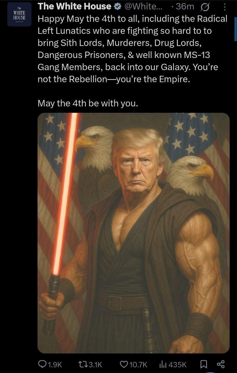 До Дня «Зоряних воєн» Білий дім опублікував у соцмережі Х (колишній Twitter) фотоколаж, на якому зображено Дональда Трампа в образі ситха. На зображенні він тримає червоний світловий меч на фоні прапора та герба США. Такий колір зброї у всесвіті «Star Wars» традиційно асоціюється з лиходіями, які використовують темний бік Сили.