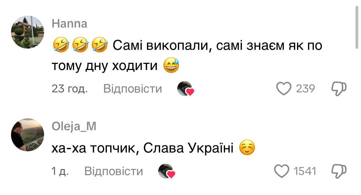 Серед коментарів українців — багато патріотичних жартів і сарказму: «Самі викопали, самі знаємо як по дну ходити», «топчик, Слава Україні», «на черзі Кремль». Відео стало черговим прикладом, як соцмережі перетворюють війну на меми, зберігаючи бойовий дух нації.