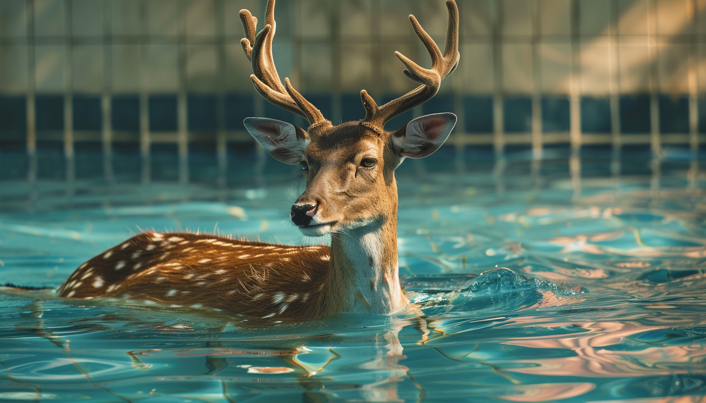 Незвичайний випадок стався на базі відпочинку Vollmer у місті Ласаль, провінція Онтаріо, Канада. Дикий олень зайшов на територію бази відпочинку і вирішив скупатися в громадському басейні.