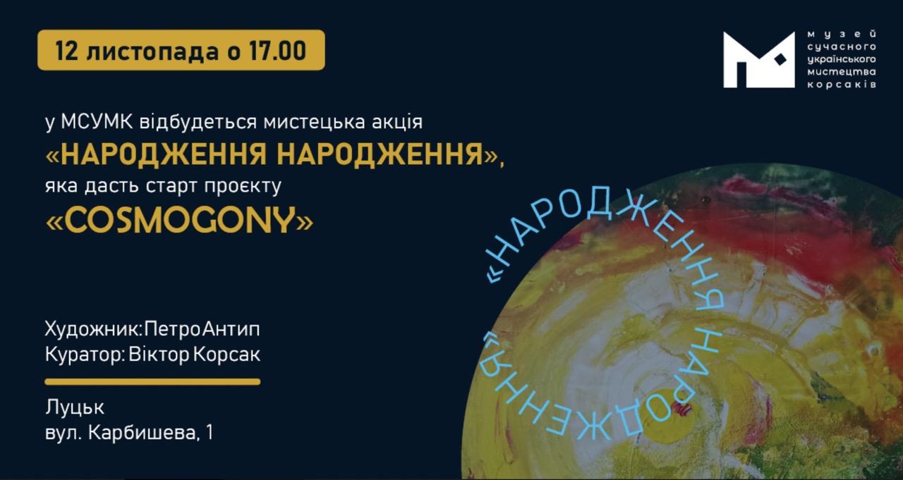 12-го листопада о 17:00 в Луцькому МСУМК відбудеться відкриття проєкту та мистецька акція “Народження народження”, яка дасть старт проєкту “КОСМОГОНІЯ”. Експозицію музею поповнить найбільше живописне полотно у світі. Висота картини сягне 10 м, а ширина — 200 м, тобто її площа складатиме 2 000 м2. Картина буде сформована орієнтовно з 300 фрагментів, кожен із яких одночасно буде окремим самостійним арт-об’єктом. Цю роботу, впродовж півтора року, буде створювати знаковий український художник — Петро Антип.