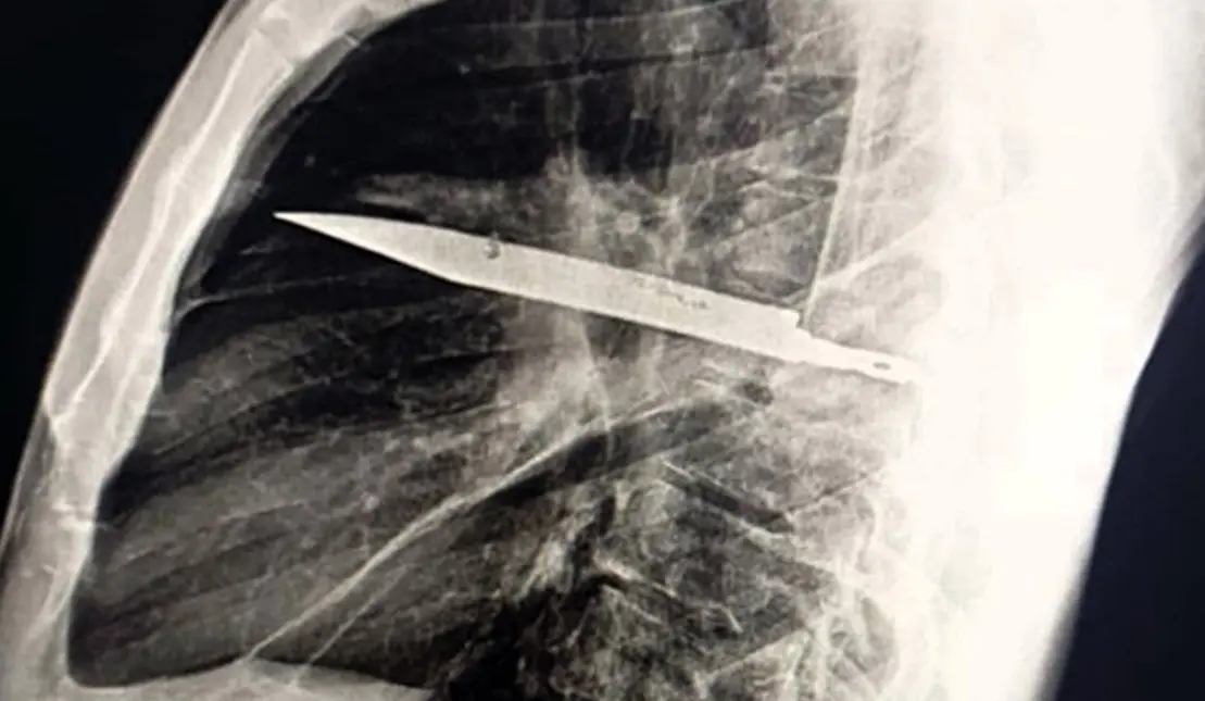 Рентгенограма виявила справжню причину незвичних симптомів: у тілі застрягло велике лезо, що пройшло через праву лопатку й дивом не зачепило життєво важливі органи.