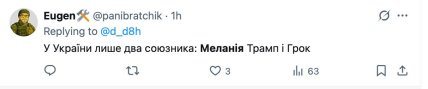 В інтернеті активно обговорюють, що у України ніби є лише два справжніх союзники — чат-бот Grok від Ілона Маска і перша леді США. Мемів та коментарів не бракує: Меланію називають чи не єдиною людиною, яка доносить Трампу правду про агресію Росії. Дехто пише, що вона стала своєрідною народною героїнею для українців.